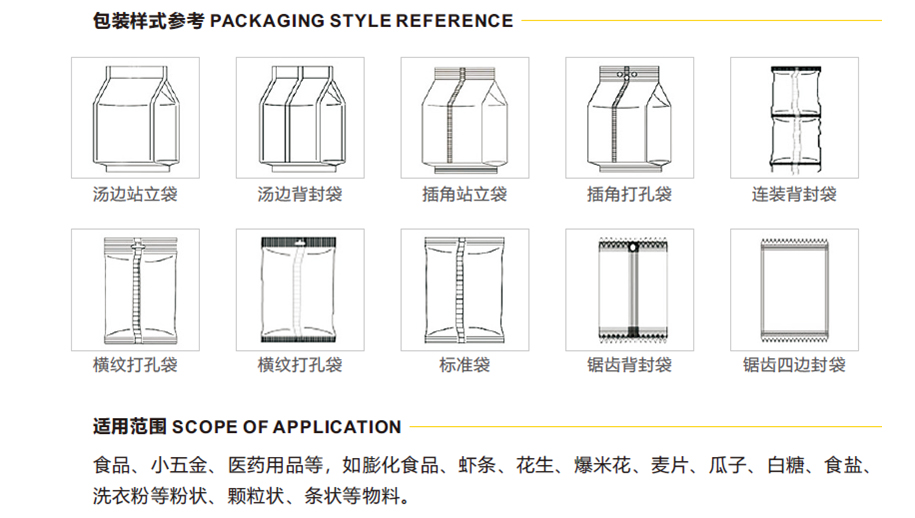 用途:適用于膨化食品,餅干,米糠,果凍,糖果,開心果,蘋果片,餃子,巧克力,五金和藥品等的包裝。